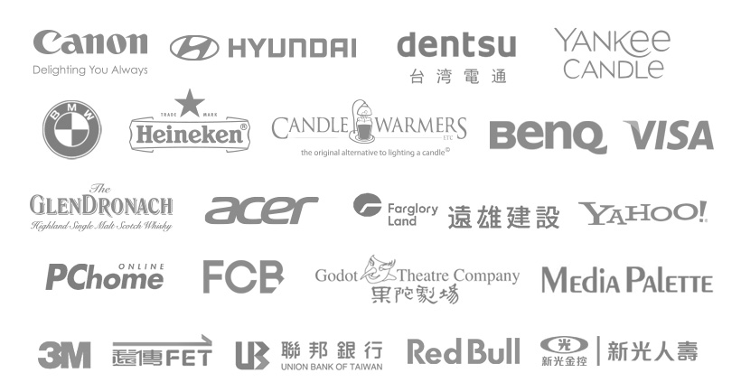 超過20年的專案執行經驗,長期服務的客戶包括Yahoo開店購物、Canon台灣佳能、果陀劇場、荷蘭銀行、資策會、台灣電通廣告、貝立德媒體等,執行過的專案客戶更是各種產業超過百家以上。專業的服務及設計深受客戶的肯定及信賴。