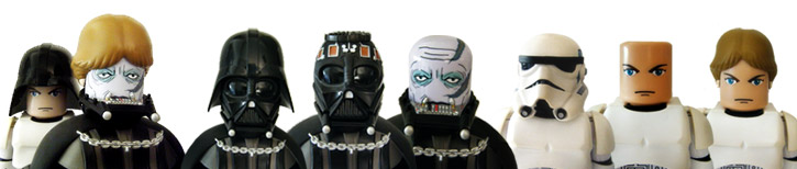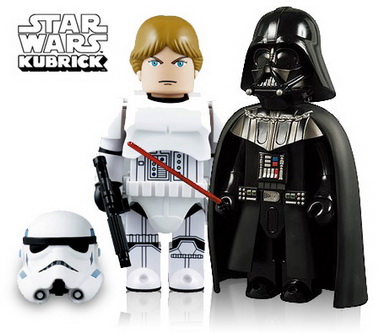 這兩枚都是由Lucasflim授權,MEDICOM TOY出品,Darth vadeR 因為大頭戴了高帽,高有30公分,頭盔可分兩部分拆解,最後露出帶刀疤及怨懟眼神的臉,少了攝人的殺氣,但維持了Kubrick一貫線條簡單的可愛風格。配件理所當然是紅色光劍,可惜胸前披風的扣鍊是做死的,而不是另外用金屬材質配上,否則想必質感會更佳,不過披風及裙襬做成硬殼包裹,線條流利,整體照型鮮明。至於白兵,當然不能比黑武士高囉,25公分的高度所呈現的比例算是相當完美,外覆盔甲手持死光長槍,頭盔拔起後是個禿頭,戴上假髮之後就是Luke了。這兩款最成功之處,我想是在於相當巧妙地簡化了角色複雜的造型以及全身裝扮,精確地保留了重點而用簡單的幾何方式呈現,讓你覺得多一分太多,少一點又太少的剛剛好。