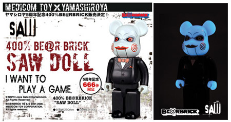 (收服了黑武士和白兵之後,正好也遇到SAW DOLL的發售日,那時還很得意的拍了櫥窗海報寄給豆腐人跟Jimibob炫耀了一下,結果開賣當天,我竟然猶豫了,因為首賣會場展示了一整櫃的BE@RBRICK,望著整個無底洞突然覺得心灰意冷,當下我退縮了。回來後被兩個人罵到臭頭,我自己也可以說是百般自責、悔恨不已,想不通那時為什麼沒買....後來台灣要價台幣2,500,整個變成個巨大的殘念。2007年底,又出了一款GID版,也就是夜光會發亮的版本,一樣是限量666枚,價格也是5,040円(台灣照樣還是兩千五的高價) 。